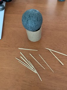 After the foam ball is completely painted and dried you can move on to adding your toothpicks. You can stick the toothpicks all around the foam in any way you choose, but to give the model a uniform look, I started placing the toothpicks on the top, bottom and sides of the model first.