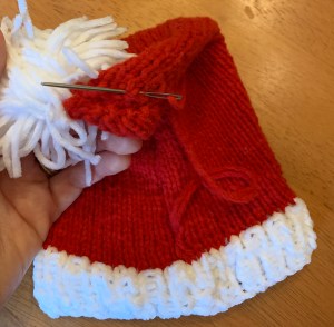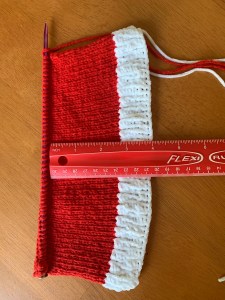 Work in ribbing for another 4 rows. Then cut off white baby yarn, leaving enough yarn to sew seam. Attach red baby yarn.