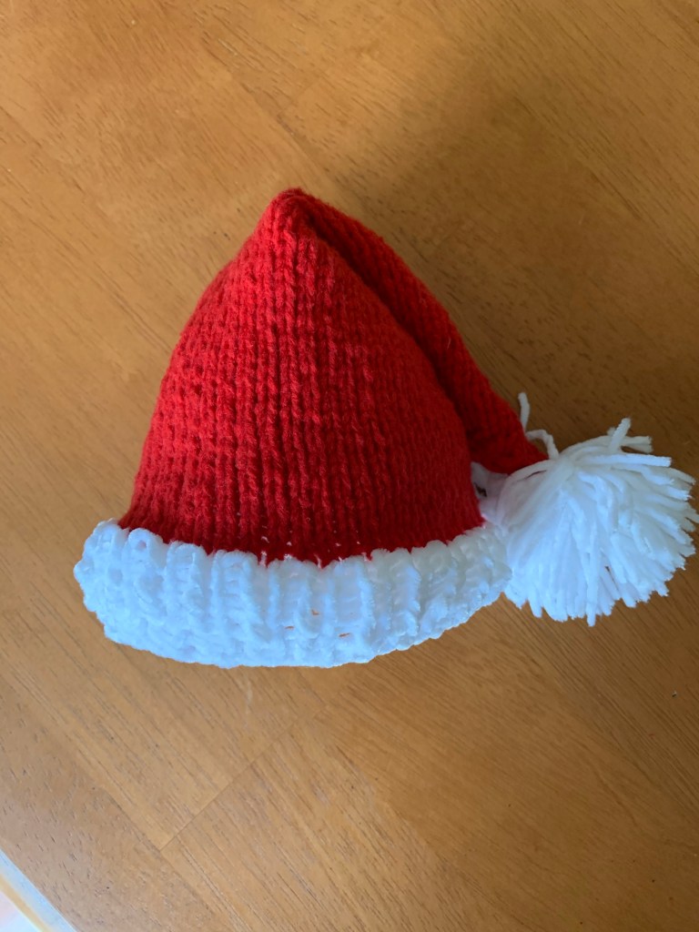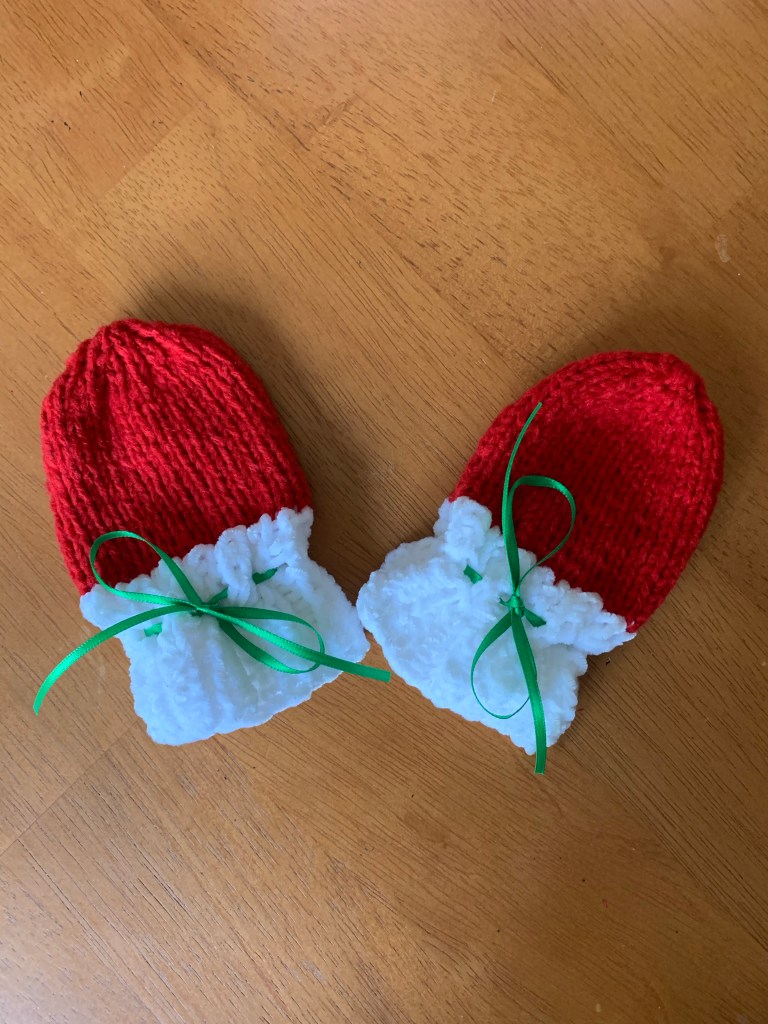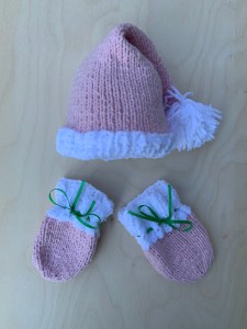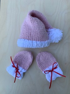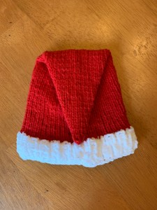 This month I have another baby knitting pattern to share. I have two co-workers having babies at the end of November, and I thought a Santa set would be perfect. The red yarn I used is Lion’s Brand Feels Like Butta in red (for a girl, try Feels Like Butta in pink) and the white is Lion’s Brand Nap Time in white. This was my first time using Nap time, and I love it. It has the feel of a bulky, soft chenille, but is thin and can be knit using small needles. The only warning I have is that if you use Nap Time yarn to make the pom pom of the hat, it can get a little messy with fly aways (it is chenille after all). The fix I found was to cut the pom pom over a table to catch all the debris. Give the pom pom a few shakes, and it should be good to go.