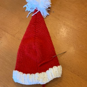 Using pom pom maker and white baby yarn, make a fluffy pom pom for the top of the hat. Then, using the tapestry needle, sew the tip of the hat down to hide seam.