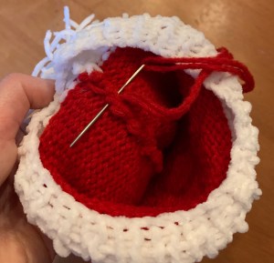 For the first row of decrease, start by K2 together, then knit the rest of the row until the last two stitches and K2 together to end row. For all even rows, P entire row with no decrease. Continue knitting first two stitches and last two stitches together of every K row until you are left with four stitches on your needle. This will give you the gradual point of a Santa hat. Cut yarn, leaving enough yarn to sew seam. Gather stitches on tapestry needle and sew seam.