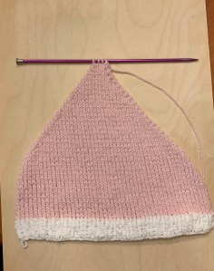 The pattern is knit on straight needles (I still cannot figure out how to knit using four needles), so there is a seam, but I hid it by folding over the tip of the hat. I added a stitch to connect the tip of the hat to the side, which keeps the seam hidden nicely. The key to making this hat work is the gradual decreases of every K row, which takes many rows of knitting to achieve. Once I figured that out, it was smooth sailing. You can increase or decrease the size of the hat to fit any size baby, just keep the stitches even.