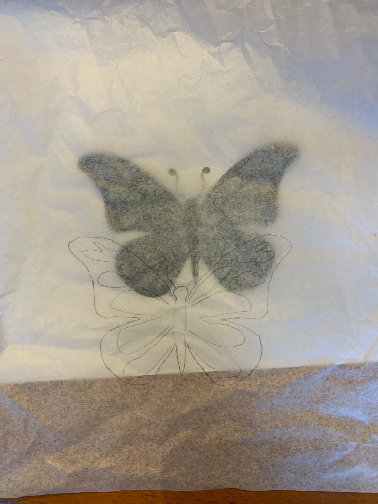 Next, I traced the picture of the butterfly I printed onto a piece of tissue. Then, I taped the tissue onto the canvas.