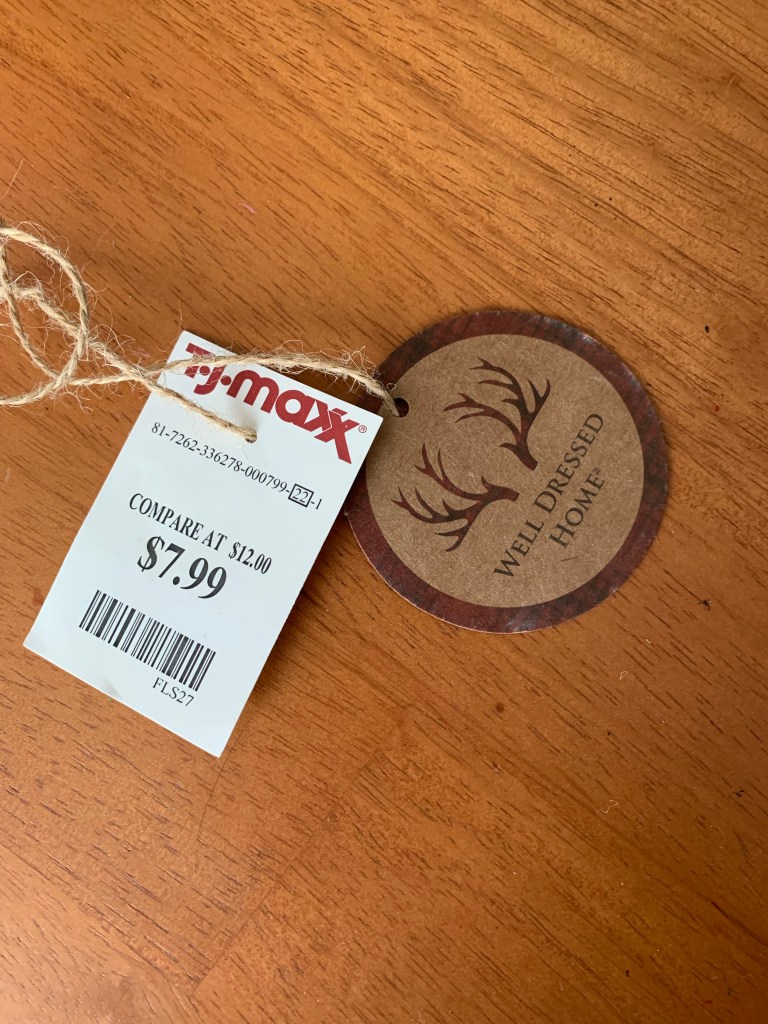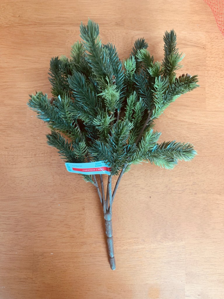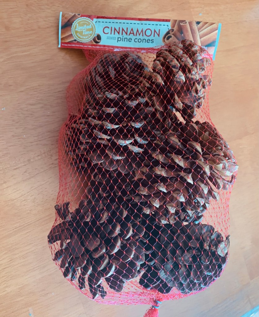 Disclaimer: Cinnamon-scented pinecones: I hate them with a passion. Unscented pinecones are available, but at the time I was shopping for this project just after Christmas, I couldn’t find any. Every Christmas season I dread the arrival of the bins of scented pinecones that fill the front of the local grocery stores. The smell is overwhelming, and I want to gag. If you’re like me, don’t despair. When you single out the bundles of scented pinecones, they don’t smell so bad. Plus, after a while, they lose their scent completely. Since the grocery store was having such a great deal on the pinecones, I decided to suck it up and buy them, although I did leave the windows of my car open a crack so I wouldn’t get a headache from the smell while I drove home.