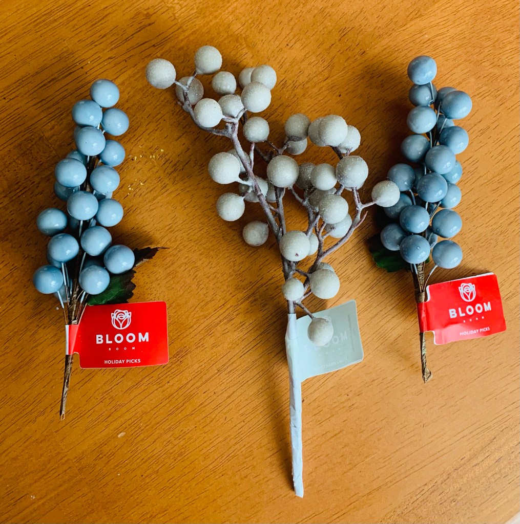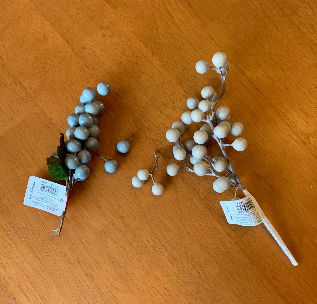 To finish the wintry look, I cut up a few picks of white and blue berries to add a touch of color to the light box. Before gluing them down, I first placed the berries to see where they would fit best. I cut the blue berries individually and the white ones in groups of three to keep the look consistent.