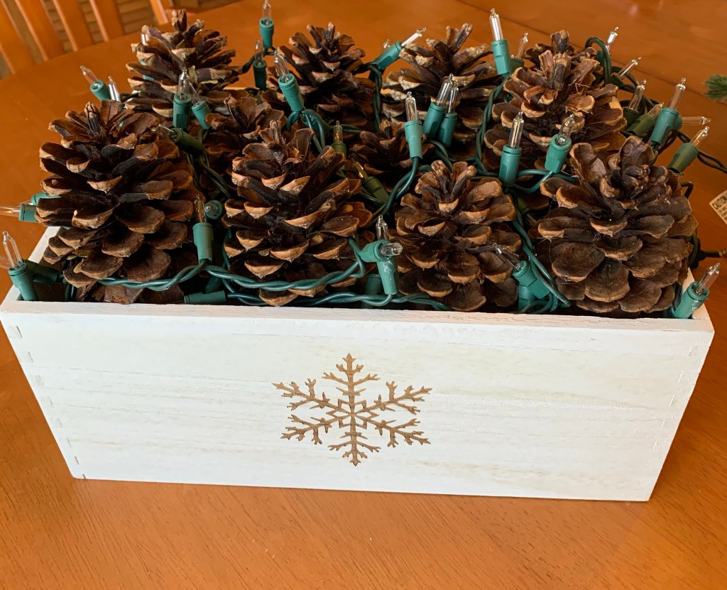 I covered the bottom of the pinecones in a healthy amount of hot glue to keep them secure on the floral foam. Letting them set for at least a half hour, I then untangled the string of 50 white lights. Lights with green wire is best since it’s much easier to hide. Keeping the plug-end of the lights hanging over the edge, I carefully wove the lights between the pinecones. Once the lights were placed, it was time to fill it all in with some pine branches and accents.