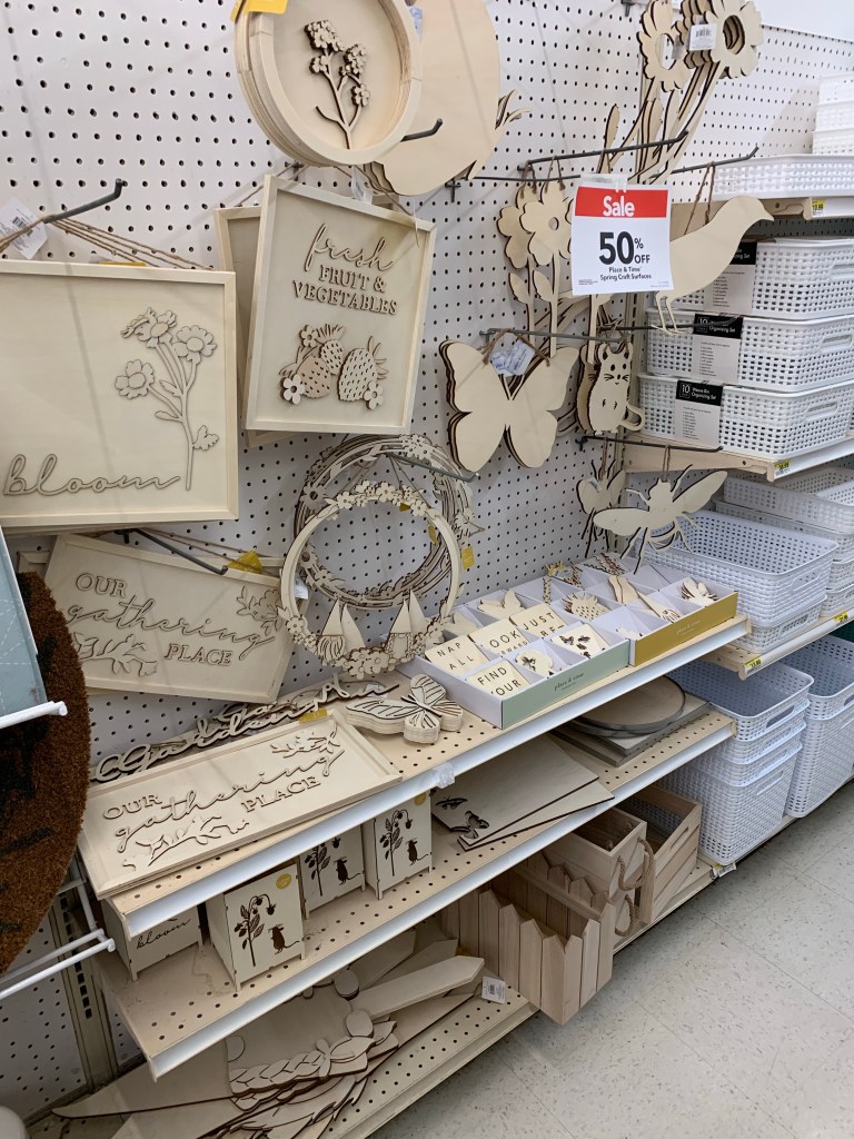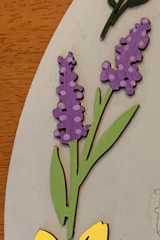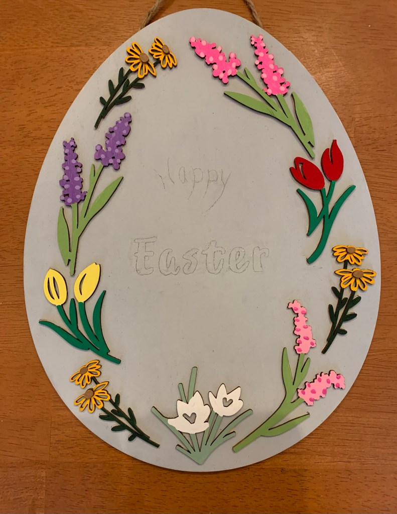 It was on a trip to Joann Fabrics to look for yarn options for this pattern that I found this month’s craft. I’m a sucker for paintable wooden crafts, and when I saw a display of Easter wooden crafts, I fell in love with an egg-shaped sign. I also fell in love with the 50% discount the store was offering. Desperately needing something to calm my nerves after pulling out yet another row of knitting, I decided to paint my sign so I could hang it in time for the holiday.