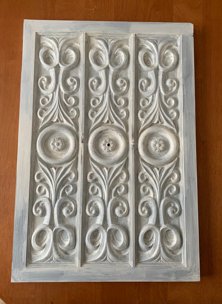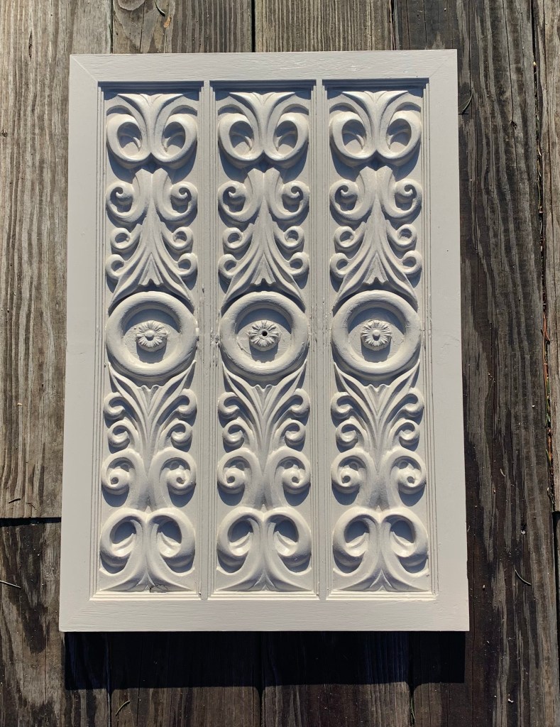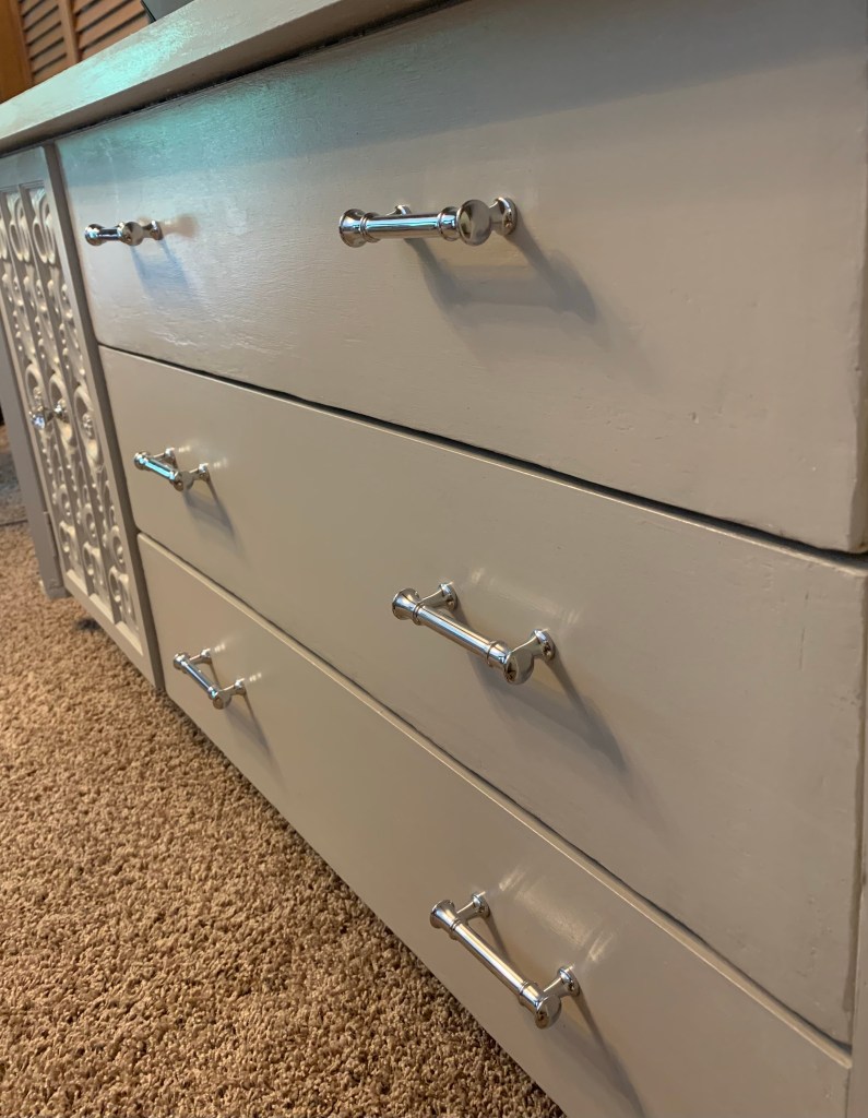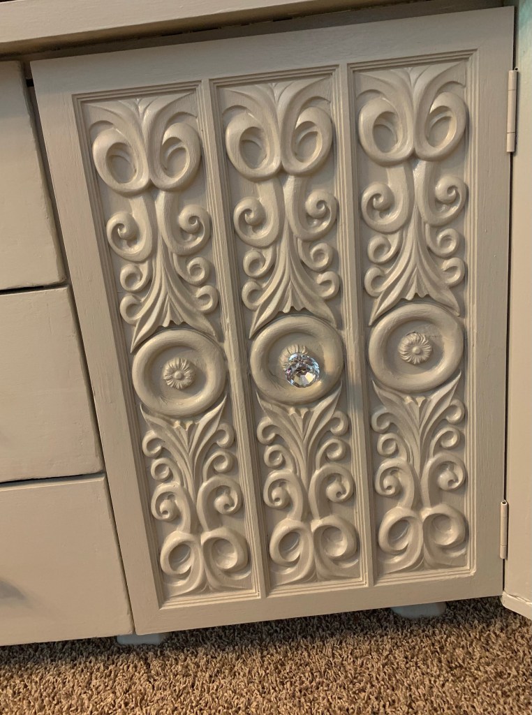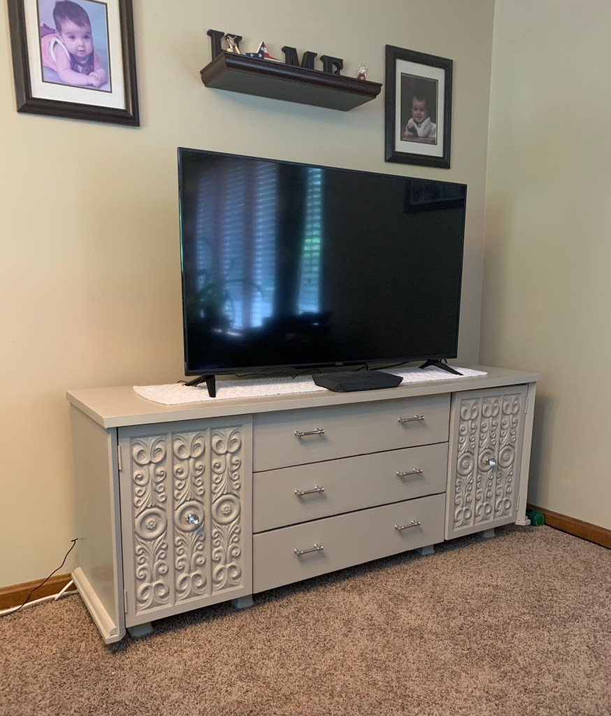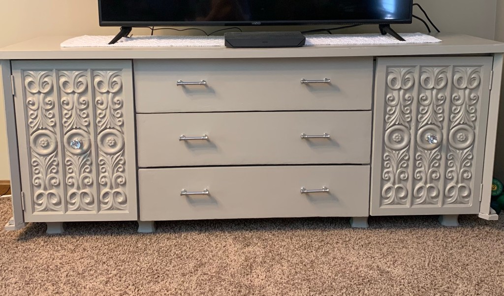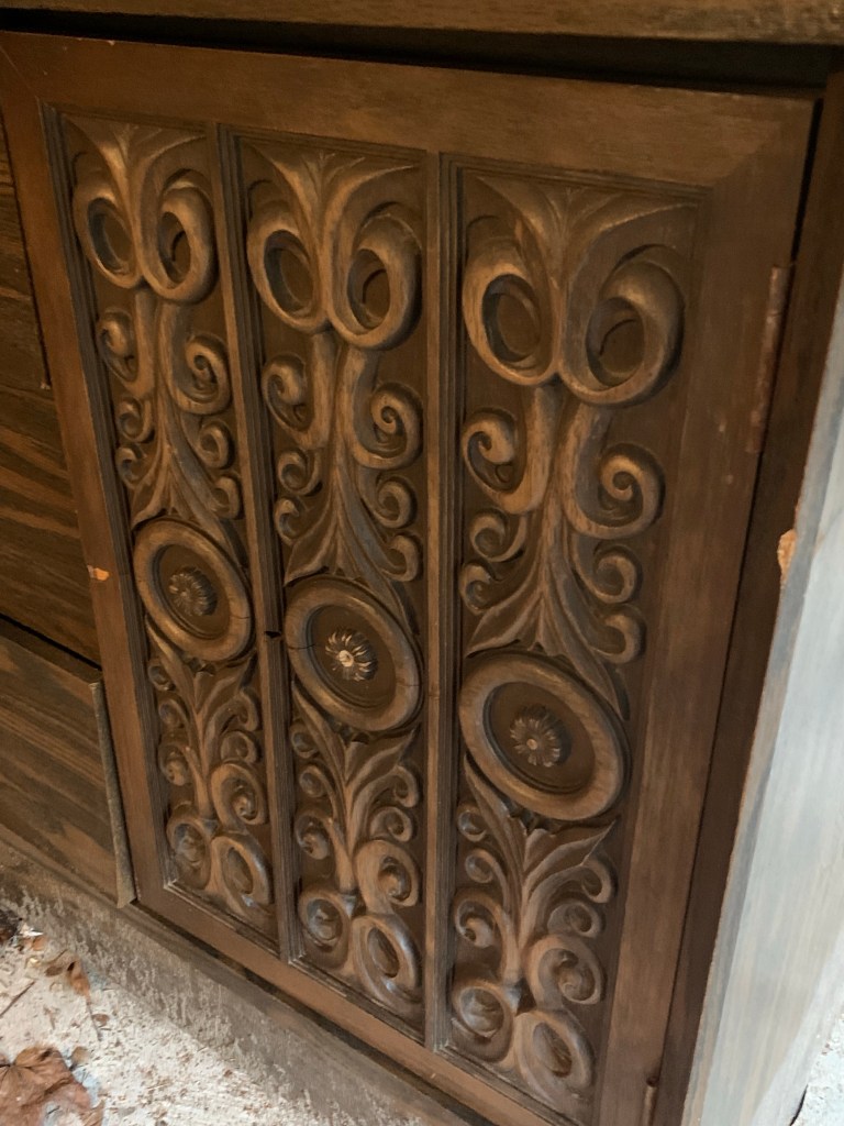 I love watching videos and reading up about furniture renovations, but I’ve always been too chicken to try to do it myself. Then one day on my way to work, I saw it. It looked like a large, ornate buffet on the side of the road. I was drawn in by the unusual decorative cabinet doors on either side of the piece. I started imagining how great it could look with some paint and new hardware. It just so happens I was looking for a table long enough to fit my TV plus provide storage.