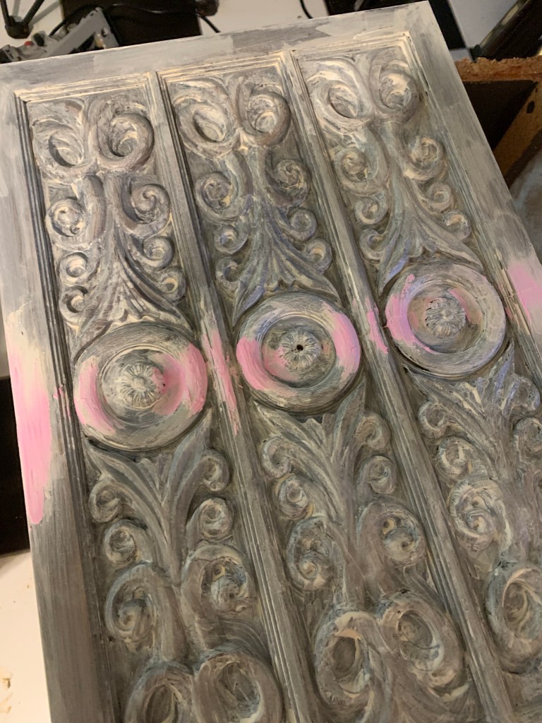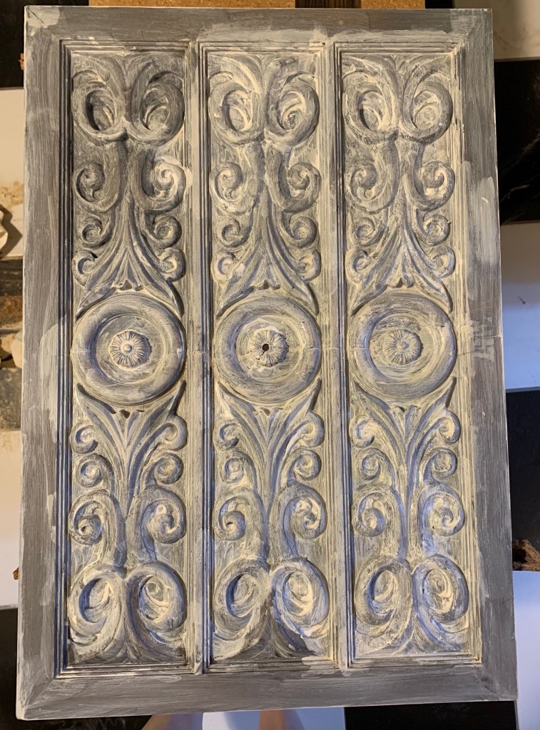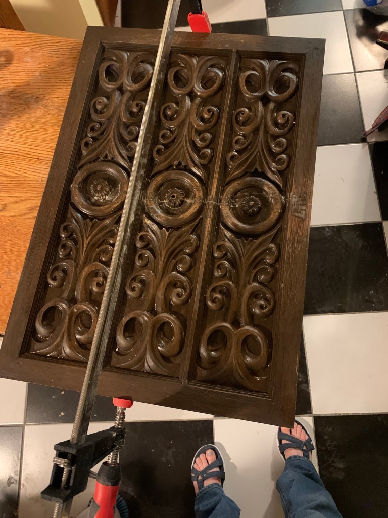 I was surprised the funky cabinet doors on either side were not made out of wood but resin. After decades of use, the resin was cracked and damaged in some spots. Using clamps, I gently applied pressure to the doors to close in the cracks. Then I used Gorilla Glue to seal them shut. The glue held the resin together and made it stronger, preventing any more damage. Once the glue dried, I sanded it smooth then applied plastic wood to repair the rest of the damage. After everything was dry, I sanded again and covered the doors with two coats of gripper primer.