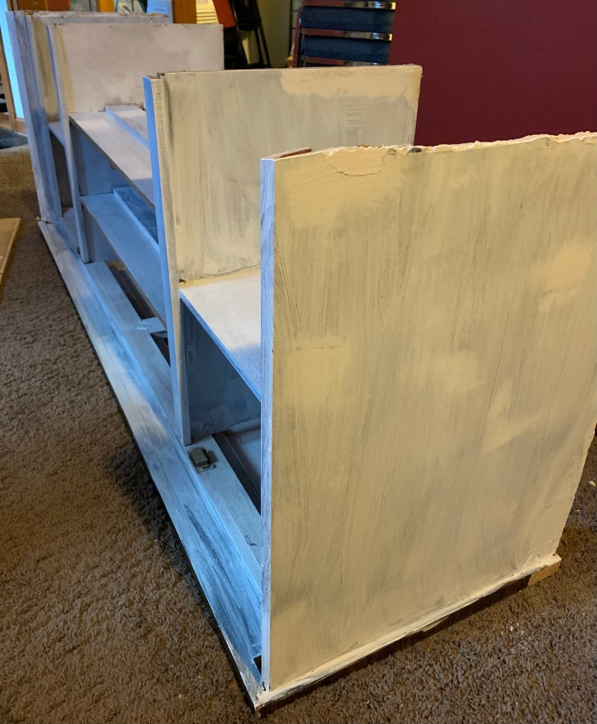 I was relieved to find out that laminate particle board could be painted and repaired. But the first order of business was cleaning. The piece was filthy, and I soon discovered it smelled very strongly of cigarette smoke. The smell was so bad, I dubbed it The Cigar Box. Even the fact that it had been sitting outside for a week did little to get rid of the stench. Immediately, I opened all the drawers to help air them out. But even after several cleanings, I could still smell smoke, so I went to the grocery store and bought baking soda. Pouring it over every crevice, I waited, hoping it would take away most of the lingering smell. After vacuuming up the baking soda, I could still smell smoke, so I decided to paint every inch of the pieces with primer. After a couple coats, the smell thankfully started to disappear.