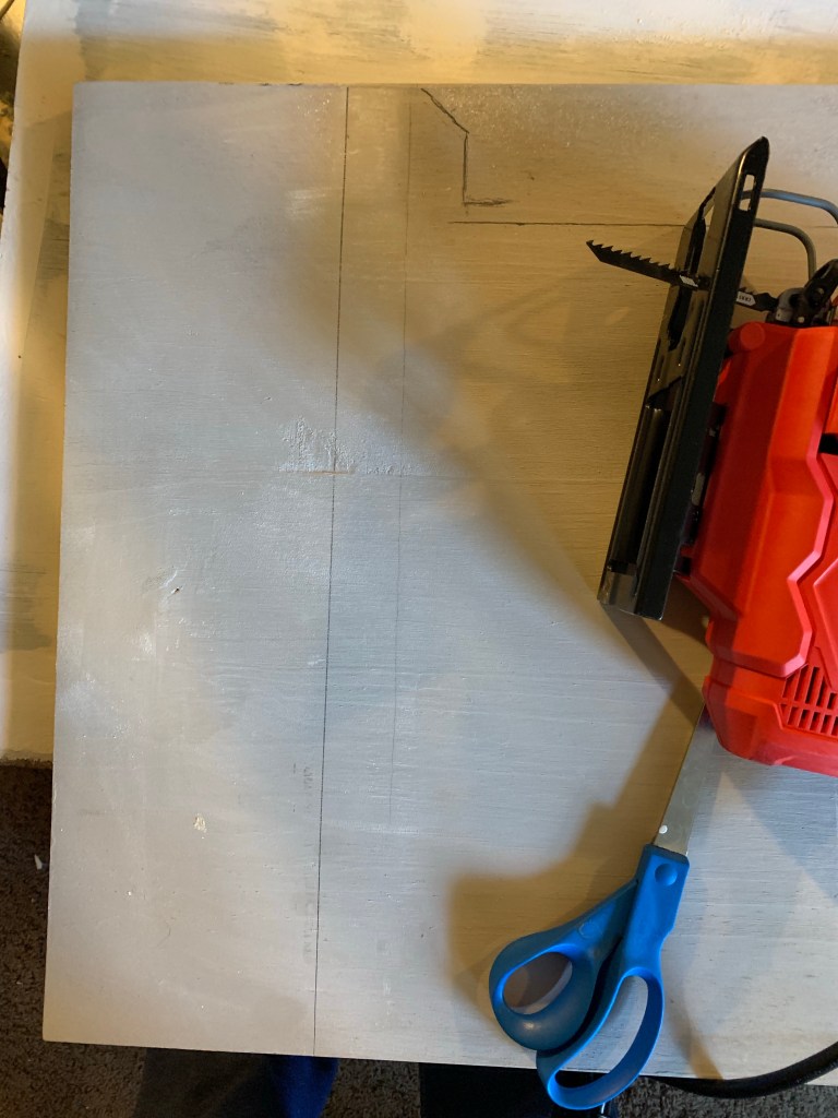 Next, I placed the dresser on top of the wood I bought and traced around the piece. I had to cut the excess from the front and sides to allow the cabinet doors and the bottom drawer to close. The jigsaw made quick work of the cuts.