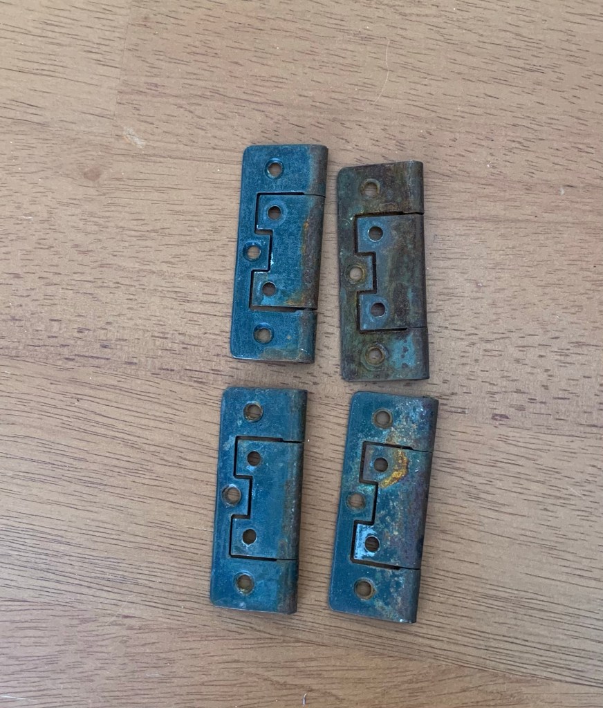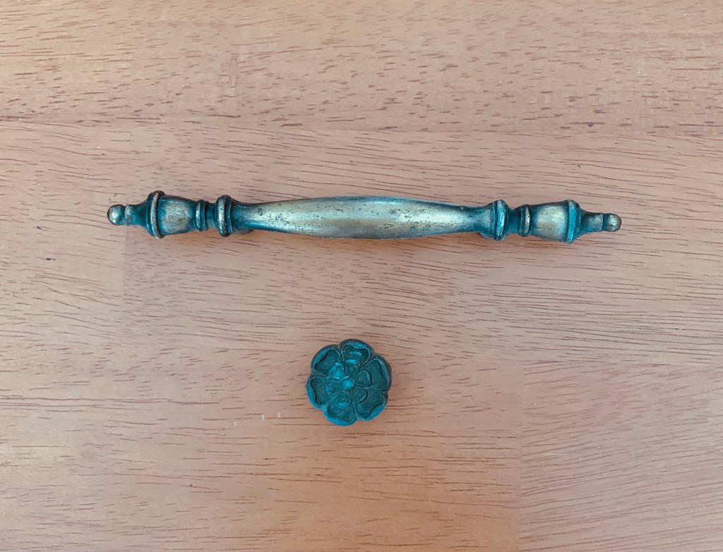 The cabinet door hinges needed a quick cleaning with a wire brush and a mixture of warm water, vinegar and dish soap. Once they were dry, I sprayed them with a metal primer, then painted them with the same taupe paint to blend in with the rest of piece.