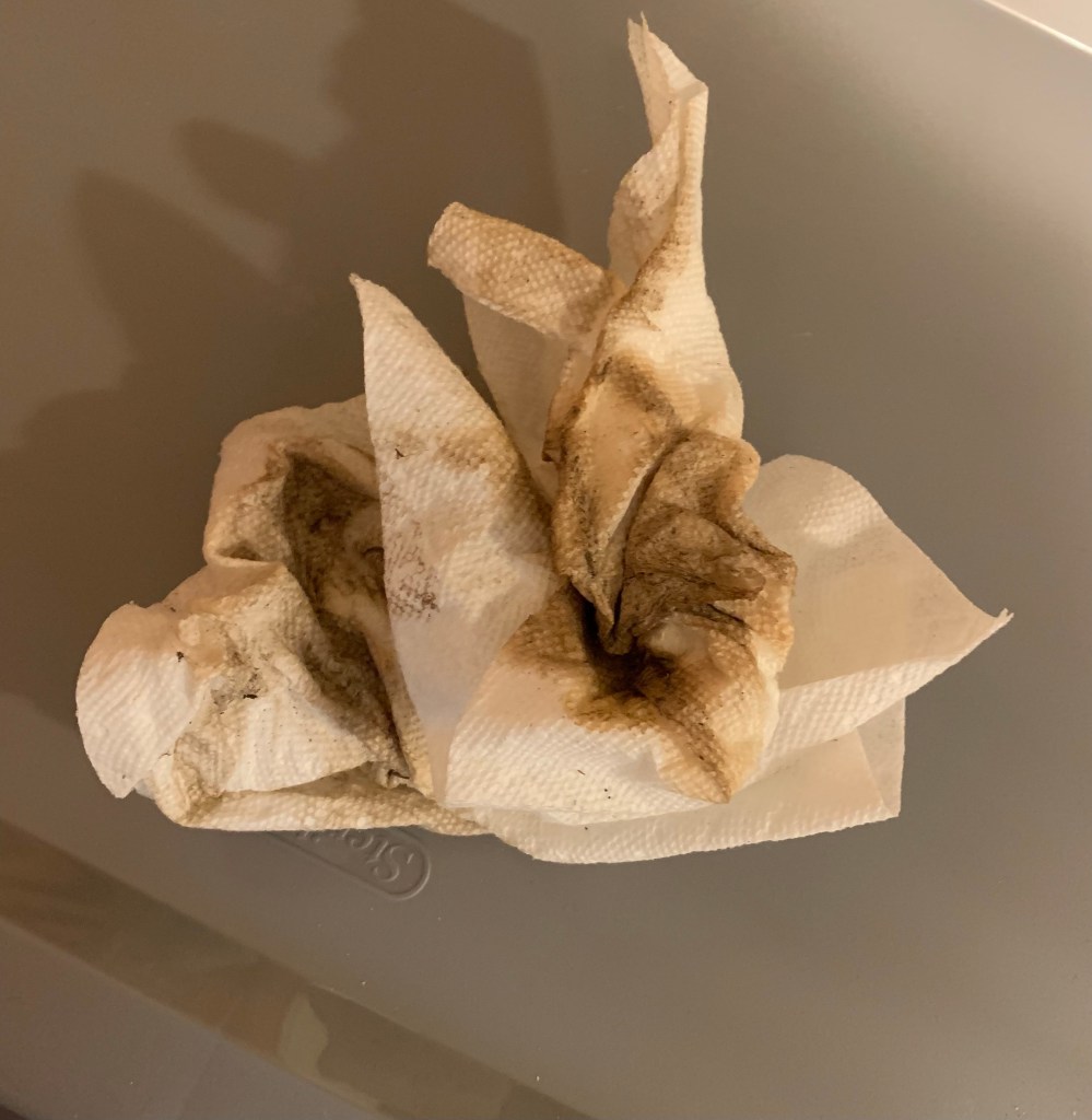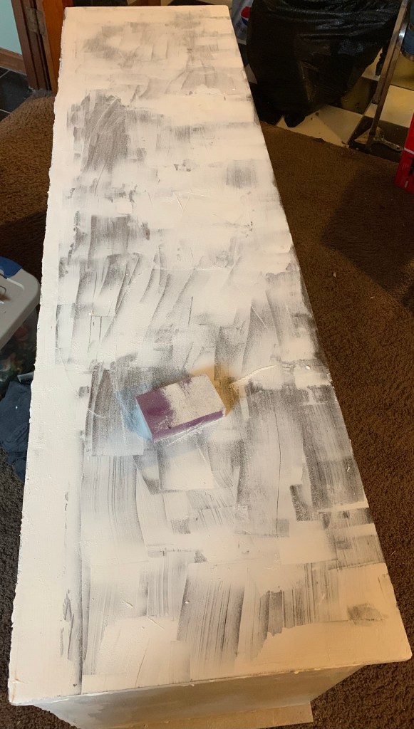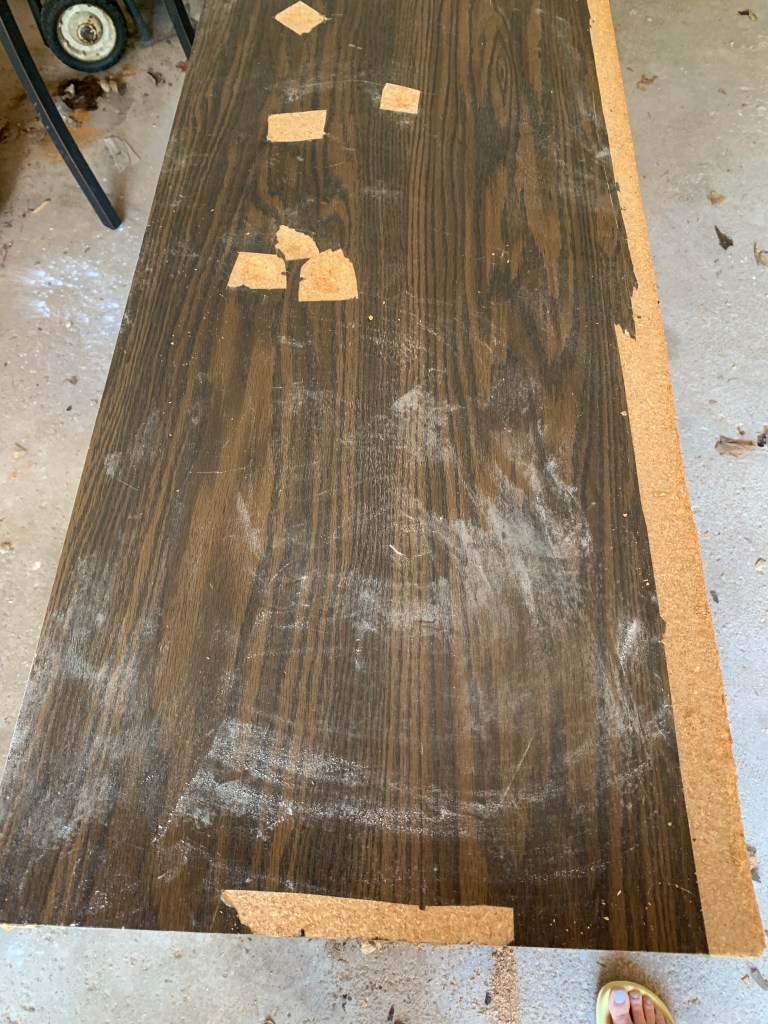 The top of the piece also had a lot of water damage and bubbling laminate. Using the razor, I scored around each bubble and then dug out the swelled particle board. After that I covered the divots with Plastic Wood.