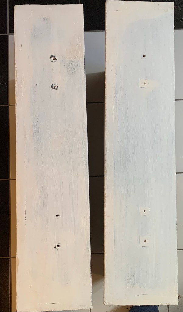 The bottom of the dresser was rotted from sitting out in the elements for so long, so I had to take it off. It was much easier than I was anticipating. It literally fell off and crumbled in my hands with just the slightest bit of help. But this left me with another problem: what to use in its place. Luckily, a trip to the home improvement store’s lumber area solved this problem. To my surprise, the store actually had a piece of wood that fit the bottom quite nicely. I also picked up some small table legs while I was there.