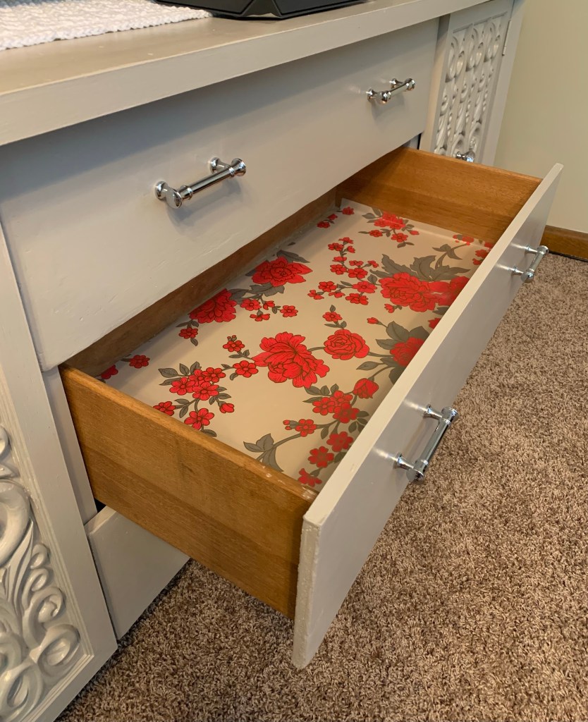 For the fixtures, I wanted to add some sparkle to the funky doors. The existing pulls were not going to cut it. Instead, I used a sparkly solitaire knob for each cabinet door and chrome handles for the drawers. I also found pretty shelf paper online to line the inside of the drawers.