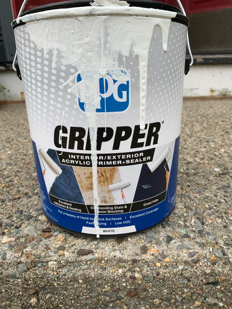 The drawers were my next obstacle. There was quite a bit of damaged laminate. Using a razor blade, I scored, then cut off all the curling laminate around the edges. Next I removed any bulging, water-damaged particle board. Then I painted a few thin layers of Gripper primer, sanding between coats.