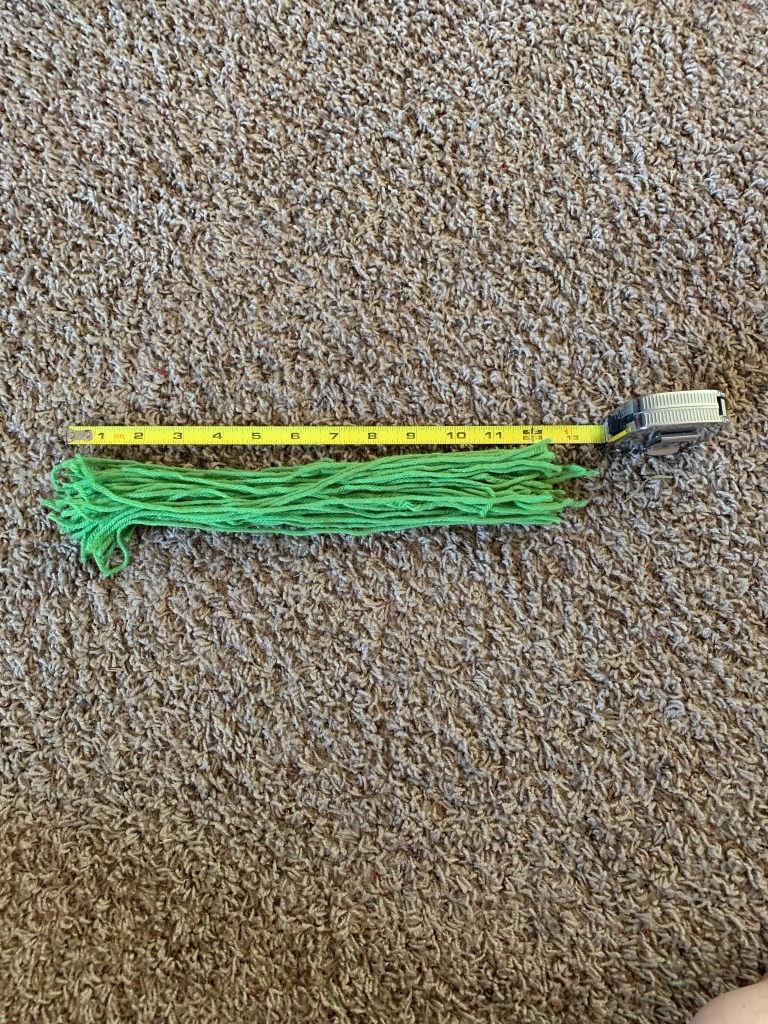 To create fringe, wind Light Green yarn around a 6 1/2″ piece of cardboard. Luckily, I have a lot of Amazon boxes laying around, and the lid of one was the perfect size. Cut yarn at one end so you end up with pieces of yarn approximately 13″ long (don’t worry if some are bigger or smaller, you will be trimming the fringe after attaching).