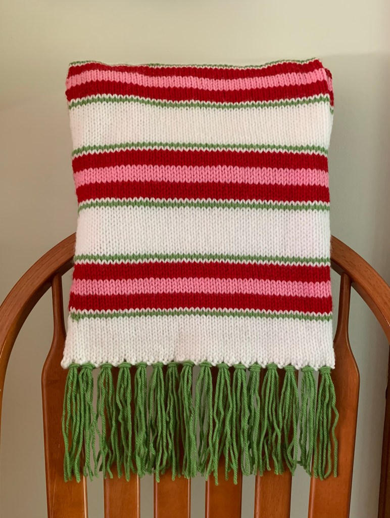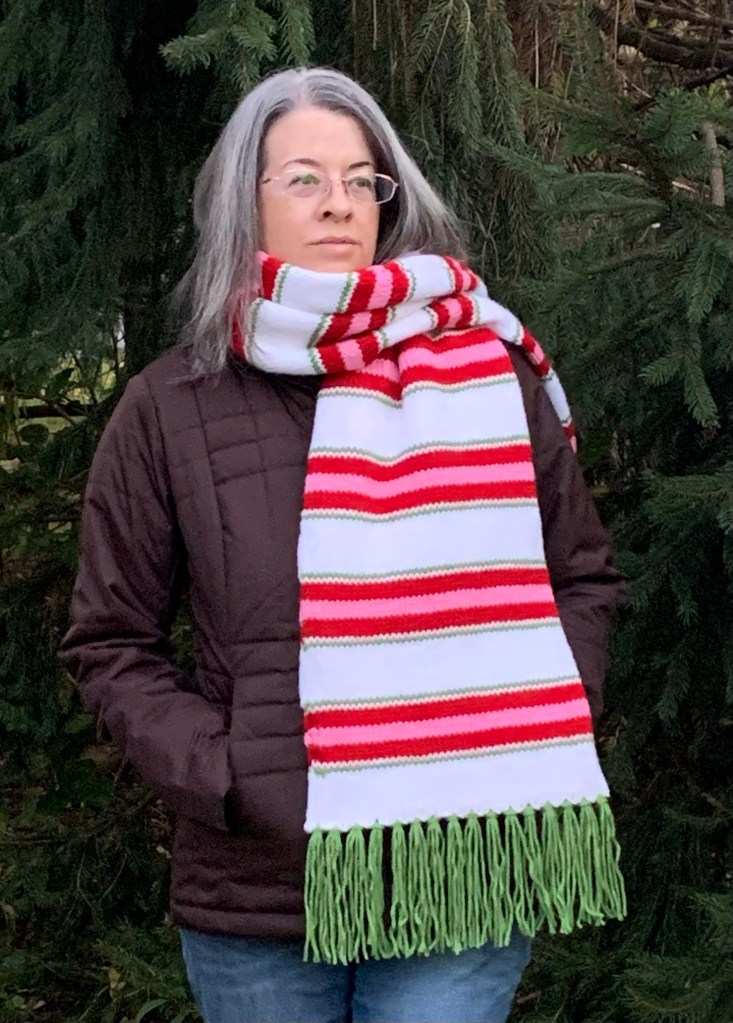 I love going to craft fairs during the holidays. It was at a Garden Club holiday plant and craft fair that I found a beautiful mug. I love collecting Christmas mugs and this one’s pretty stripes caught my eye. I couldn’t take my eyes off it. So, in my cabinet it went. It joined the rotation of Holiday mugs I bring out after Halloween. Then, last year it hit me. How wonderful would these stripes look on a scarf?