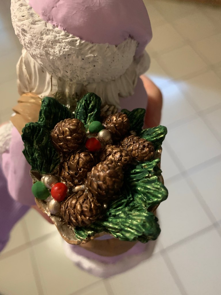 I ditched the gold sack for a more subdued brown then I painted the all-gold pinecones and branches in the sack in festive holiday colors. I toyed with the idea of painting his boots to match the royal violet of his belt, but my daughter convinced me not to do it. I thought the silver boots looked a bit like space boots, but they actually don’t look bad with the lavender paint and matching silver mittens. To finish, I sprayed him with a clear sealer.