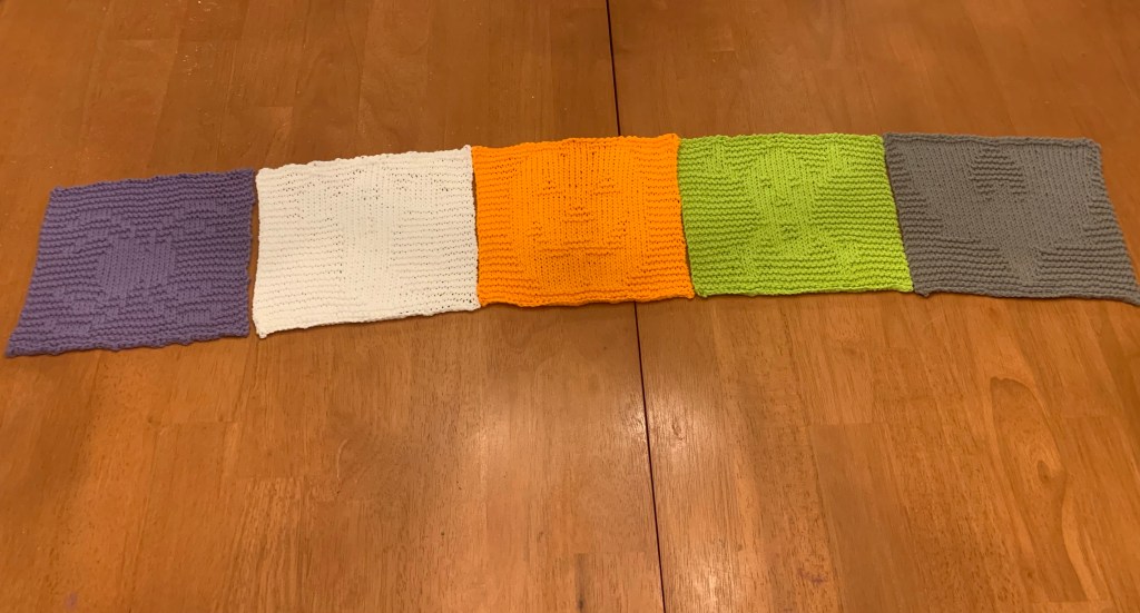 It’s finally done! After knitting for most of the summer, I completed my last square in my Halloween table runner: a jack-o-lantern. Between work and other commitments, it took me a while to finish this one, but I’m glad I did.