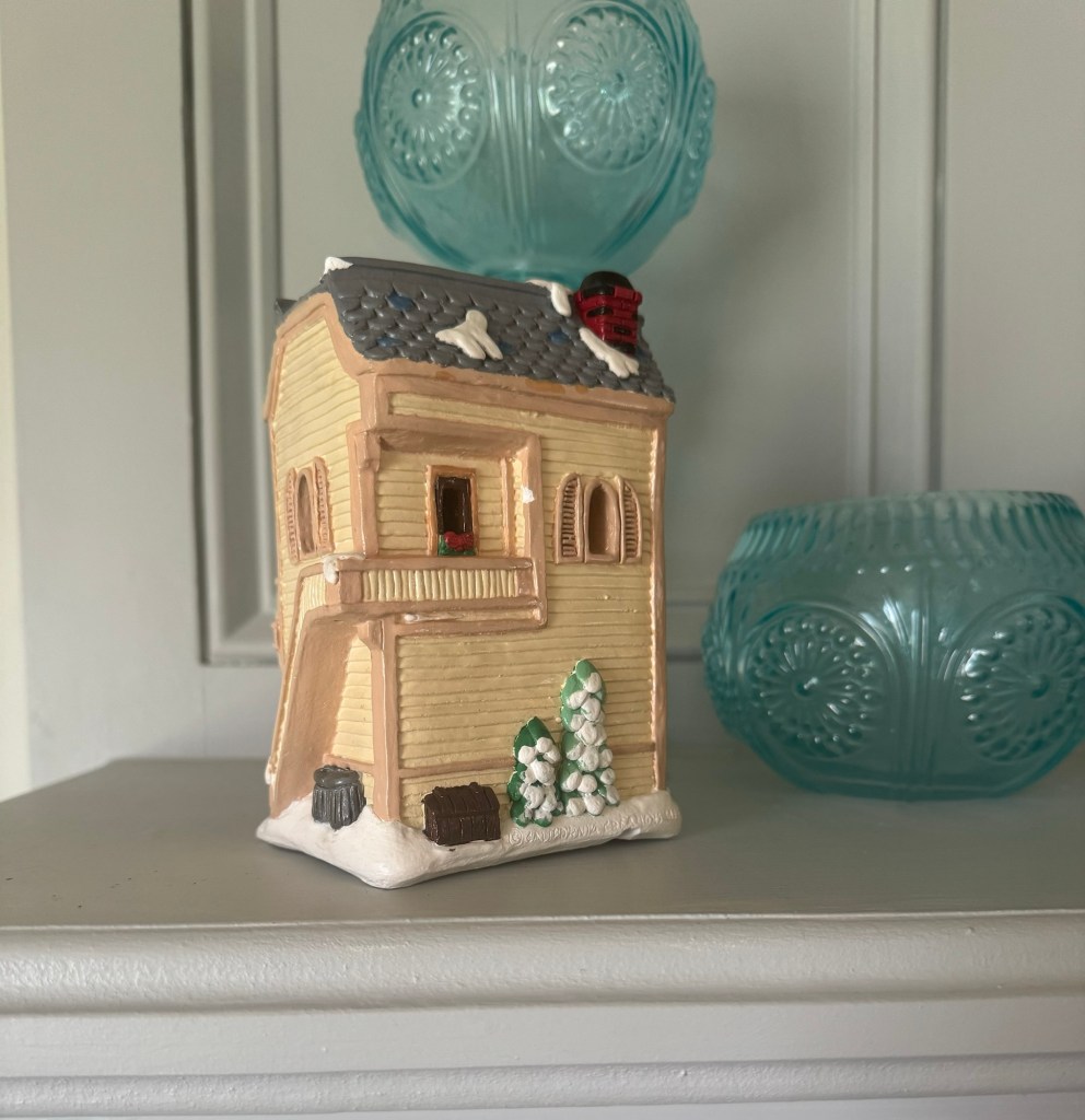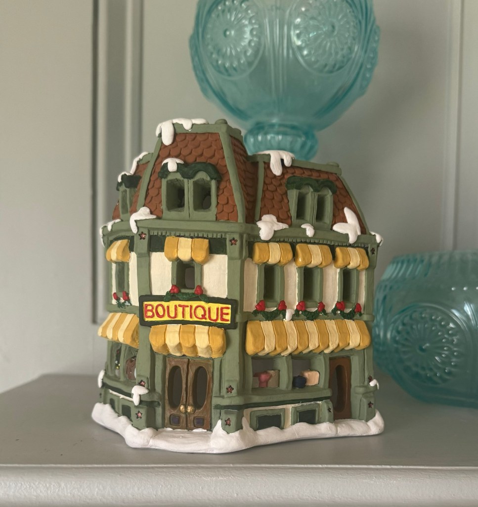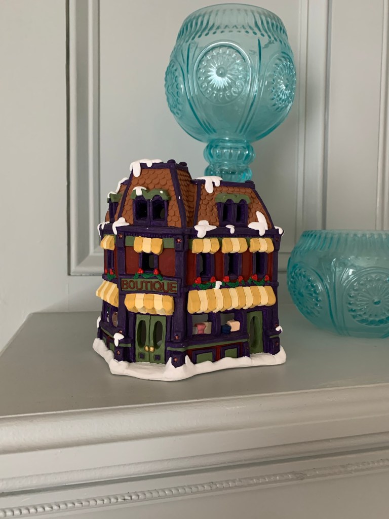 Where do I begin? There were many reasons why I gave up on the Boutique. The dark maroon and purple made it look haunted, and it looked odd alongside my other village pieces. But the biggest reason was that after spending many hours painting, and then being disappointed in the way it turned out, I didn’t want to waste any more time with it. I didn’t know how to fix it, or if it could be salvaged.
