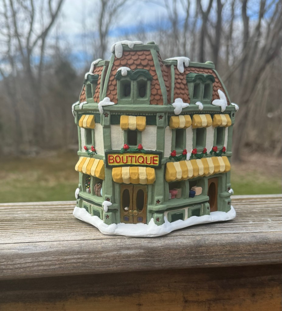 In the last couple of years, I’ve added lighted stands to help illuminate my collection. My plaster Christmas Village has become something I’m proud to display. I keep it up well after Christmas most years. But I still have many that I haven’t finished, and some that I haven’t even started. Sometimes when I come up with a color-scheme on paper, it doesn’t translate well on a village piece. That is the case for my Boutique. So, it stayed hidden in my basement for years.