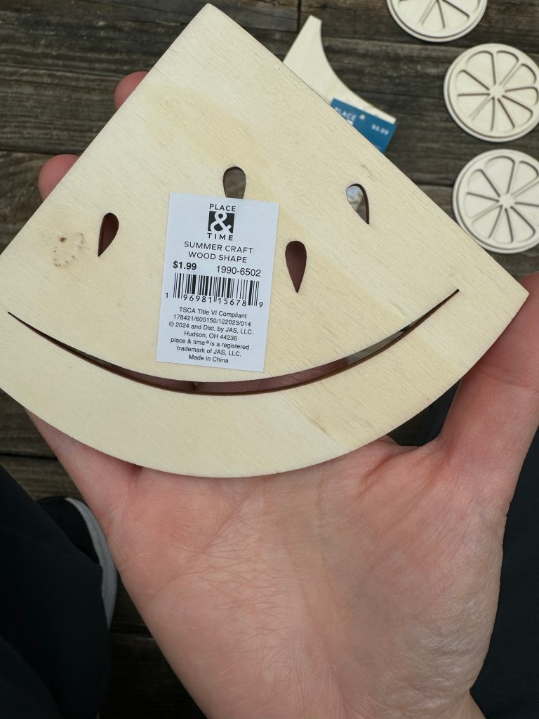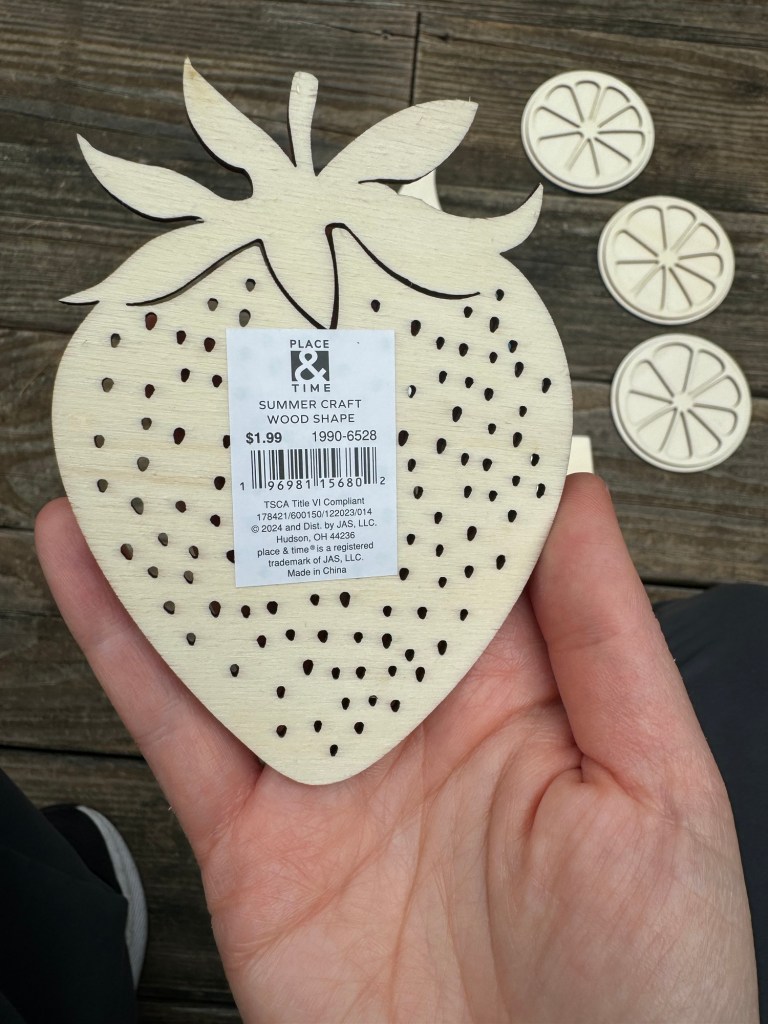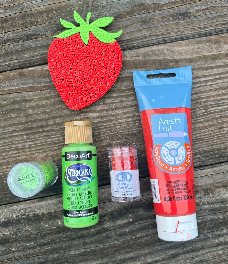 I found some wooden cutouts at the front of the store on clearance. I picked up a set of four fruit-slice coasters, a strawberry and a watermelon shape . Then I went straight to the paint and Diamond Dotz section. I was sad to discover that JoAnn’s is getting rid of their Diamond Dotz Freestyle section, but I was able to pick up a lot of colors in the clearance bin.