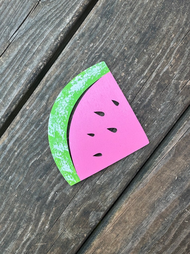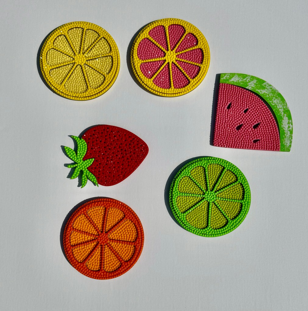 After finding coordinating paint and Diamond Dotz, I got to painting. The pieces were small, so it didn’t take long to paint them all. Luckily, I was able to use the same colors for a few of the fruits, so that helped with the cost of this craft. For the watermelon I used a small piece of sponge to create white on the rind.
