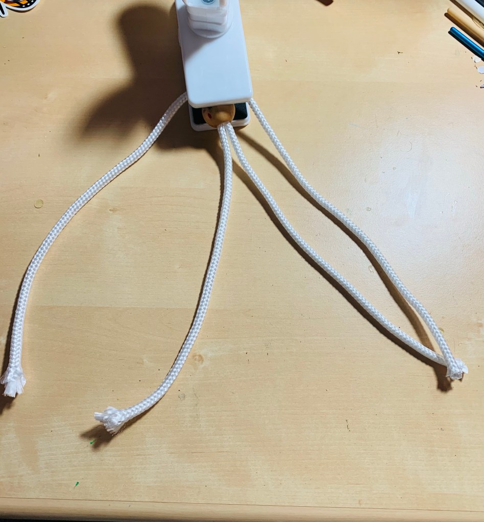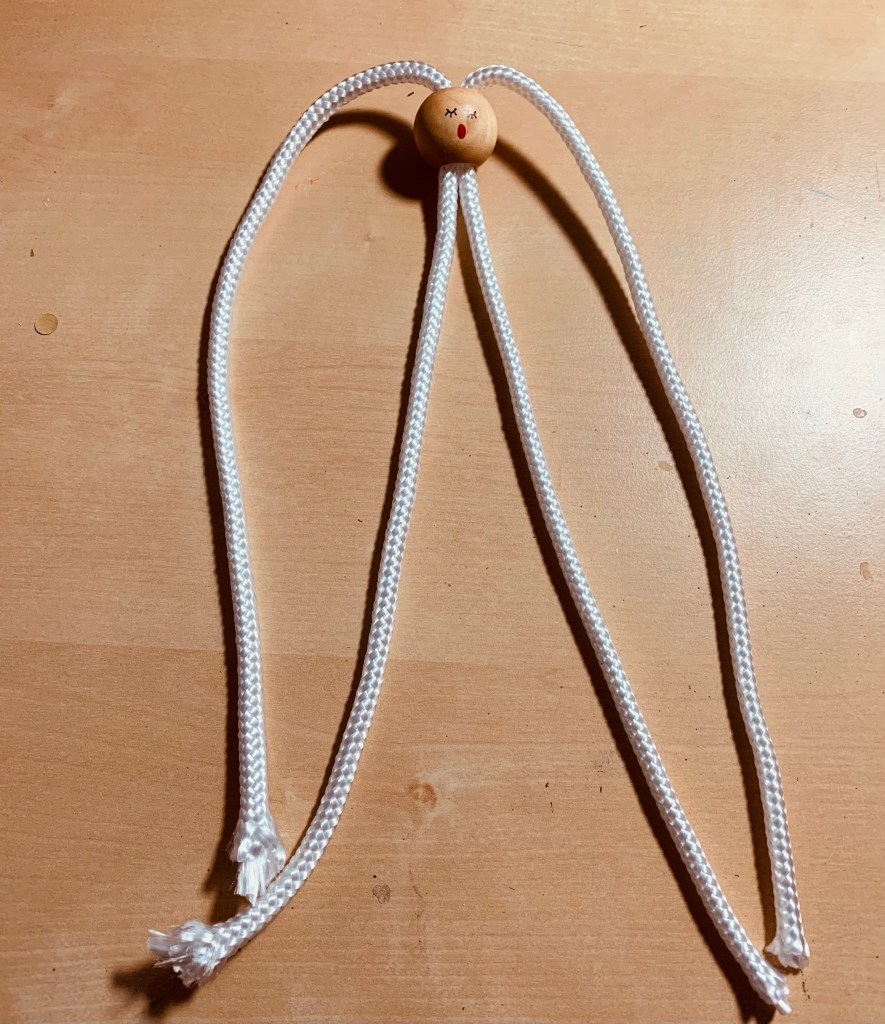 Start by tying a basic square knot. To stabilize the bead, I used an old desk fan clip, but you could also use a clipboard to keep it steady. Again, the thicker rope makes tight knot making difficult, so do your best to get it as tight as possible. After I completed the first square knot, I made a square knot with a loop to create the angel’s arms. It took me a bit of practice and youtube watching to get the loops even on both sides, so it may take a couple tries. The good news is that if you screw up, you can simply untie the knot and try again.