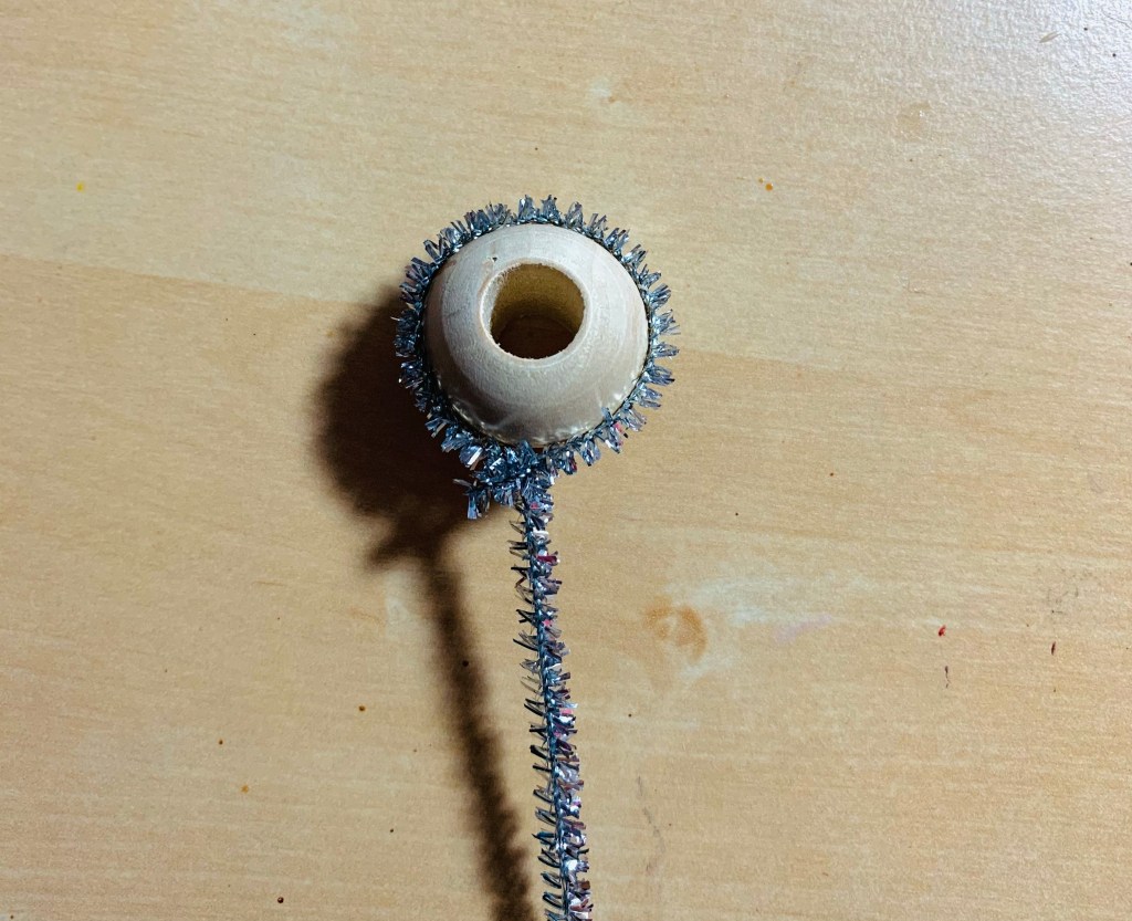 Lastly, I cut a piece of 4” silver pipe cleaner for her halo. The halo can also be used to hang her on the tree. My angel’s halo stuck straight over her head, so that’s how I made my recreation, but you can bend the halo so that it hovers over her head if you want. I used a spare wooden bead as a guide to make my halo a perfect circle. Dab the end in a little bit of glue then insert into the opening of the bead.