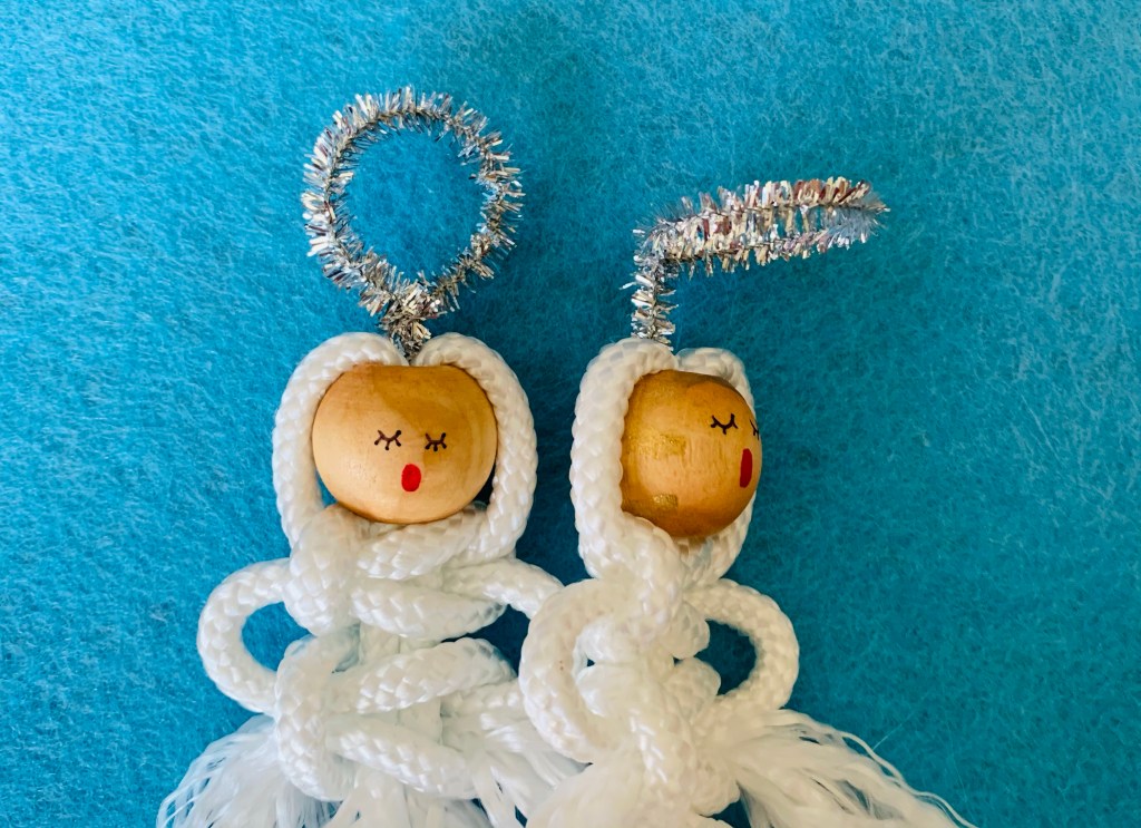 Finally, last month I started searching for the perfect materials. I had to at least try to recreate this beautiful ornament. From my memories, the angel was made from thick, white yarn or rope with a wooden bead for her head. A simple silver pipe cleaner served as her halo. To practice, I bought some standard macrame cord. Though it was helpful to practice with, I quickly realized it was far too thin to work for this project. Back to the internet, I found some thick, white clothesline rope that looked the closest to my memories. I also picked some wooden beads and silver pipe cleaners. After a bit of practice I realized with just a few inexpensive materials I could recreate the caroling macrame angel.
