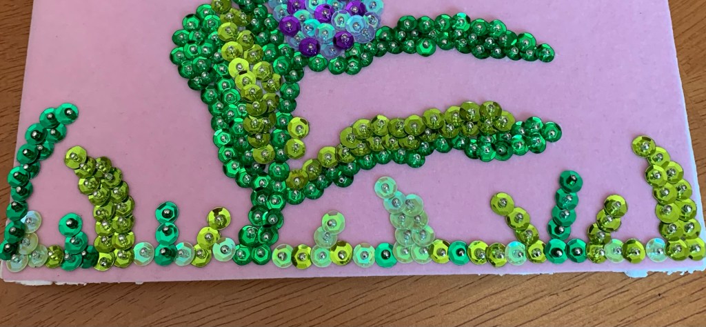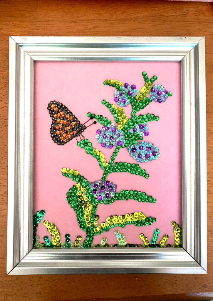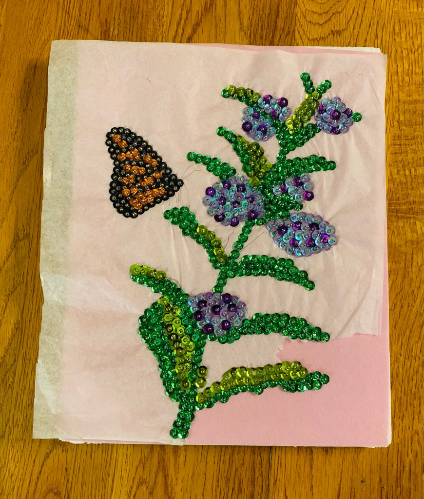 Next, I began to sequin. For the milkweed flowers, I used lavender sequins and sprinkled a few dark purple sequins in for added color. I also used two different colored green sequins for the milkweed’s leaves. When I was done, I simply tore the tissue away to reveal the finished product.