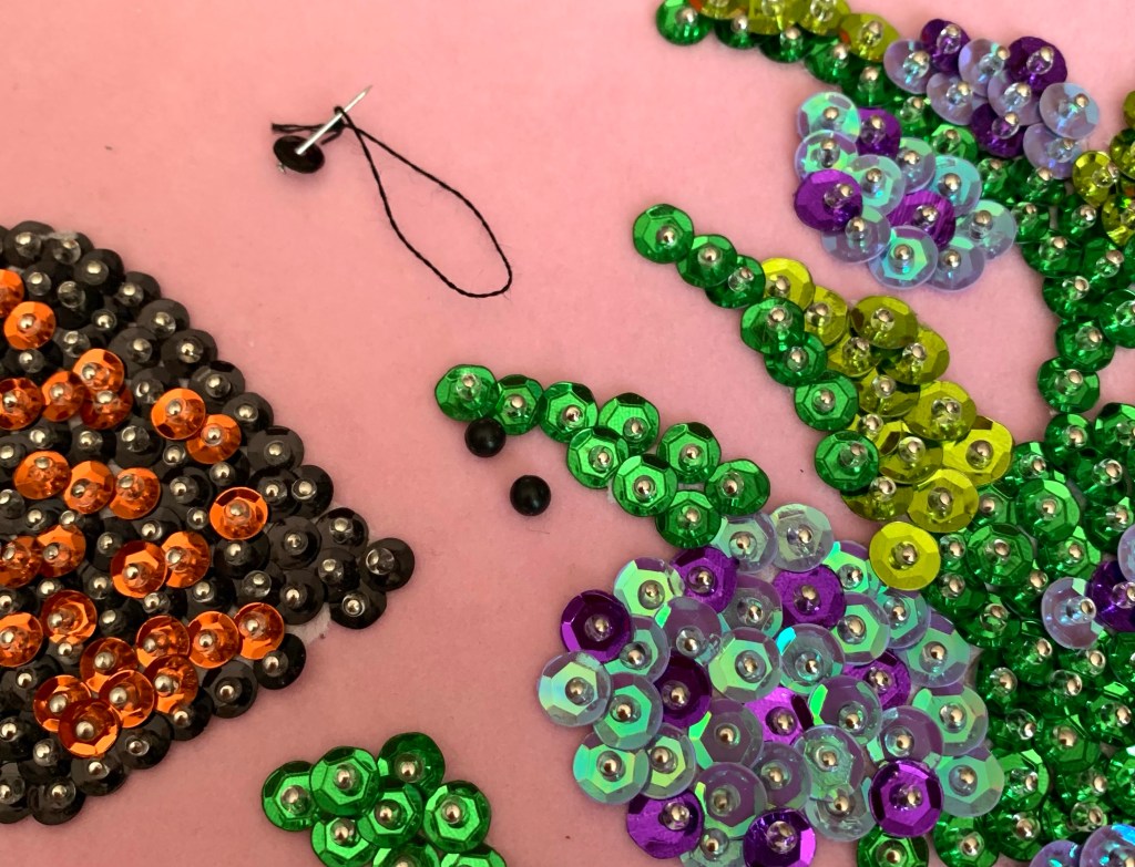 When I finished the milkweed plant and butterfly, I decided to add a few blades of grass in all the green sequin colors I had.