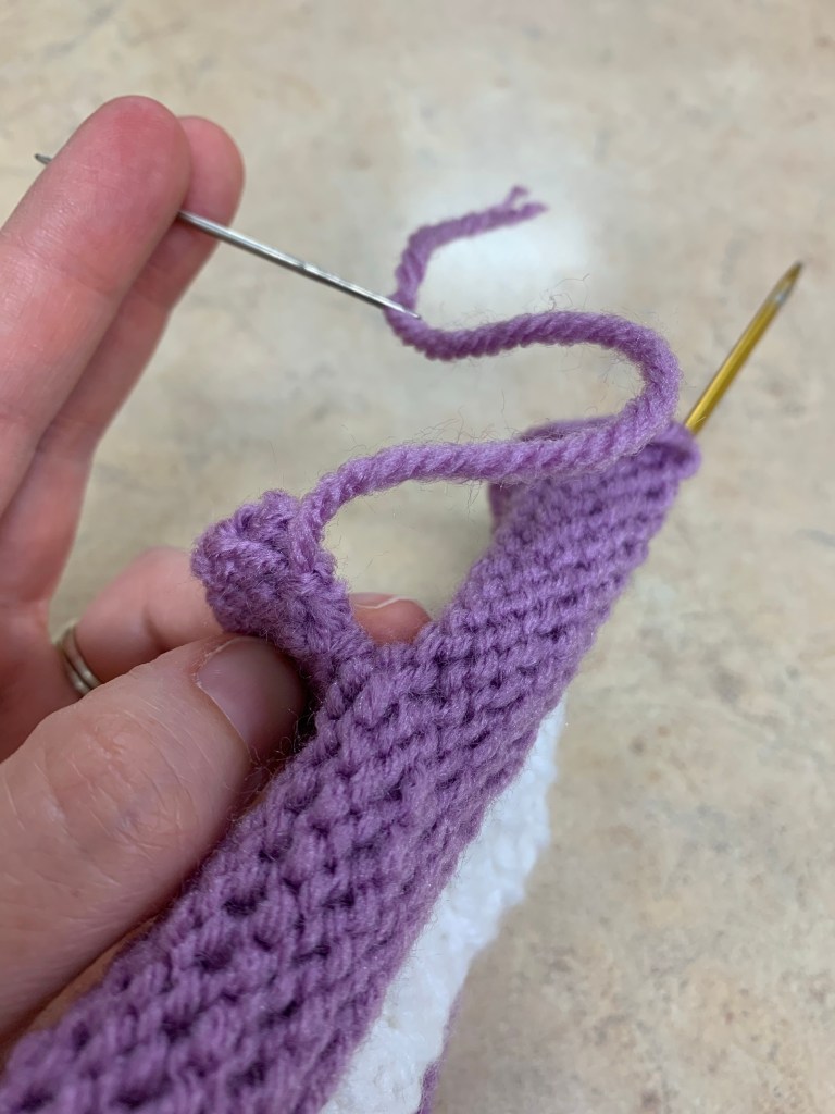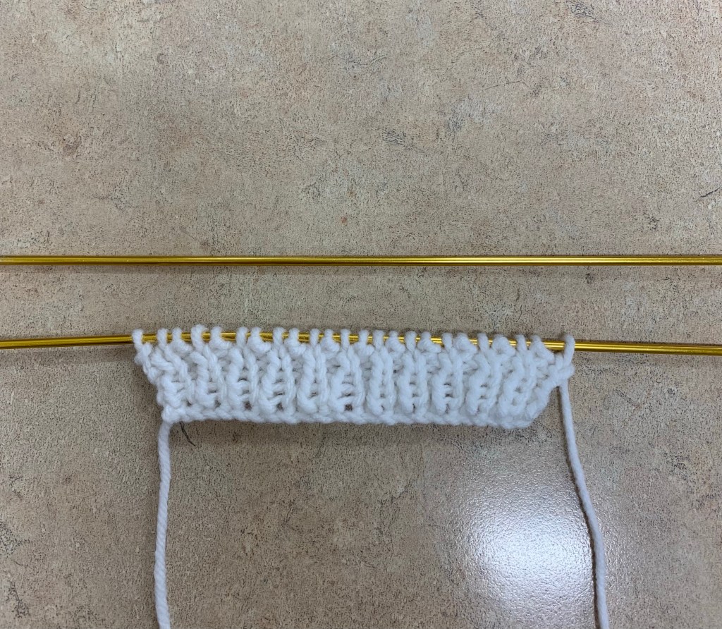 To finish, K 2 together across row. You should be left with 6 stitches on the needle.