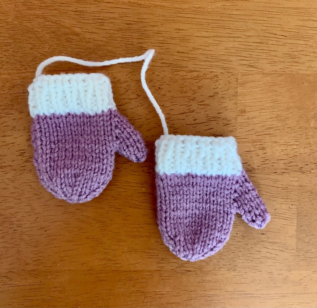 I took a knitting class over twenty years ago with my sisters, aunt and cousin. It was offered at my old high school at night as part of the continuing education program. The teacher was great, and she started us off with a simple mitten pattern to learn the ropes of knitting. Making mittens is a great way to learn the art of knitting because it includes several components. Any basic mitten pattern includes the ribbing stitch, the stockinette stitch, increasing a stitch, and decreasing a stitch. Not to mention sewing a seam. After that class I was hooked on knitting. I’ve also come up with a few of my own patterns. Tweaking the first knitting pattern I followed, I came up with a miniature version of mittens to be used as an ornament. I created this pattern to sell at a Christmas Fair, but you could also use these little mittens to decorate a gift bag or even for a gender reveal. Leave them empty or fill them with candy.