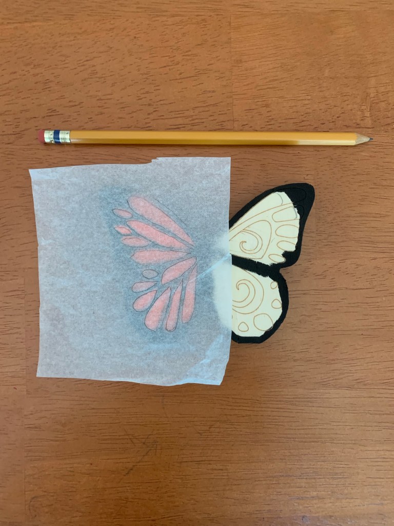 Using a picture of a Monarch Butterfly as my guide, I drew the patterns of the wings with a pencil. To make the wings as identical as I could, I used a piece of tissue paper and traced the pattern on one side of the wing. Carefully, so as not to rip the tissue paper, I traced the pattern on both sides of the tissue paper so that the image would transfer onto the wood.