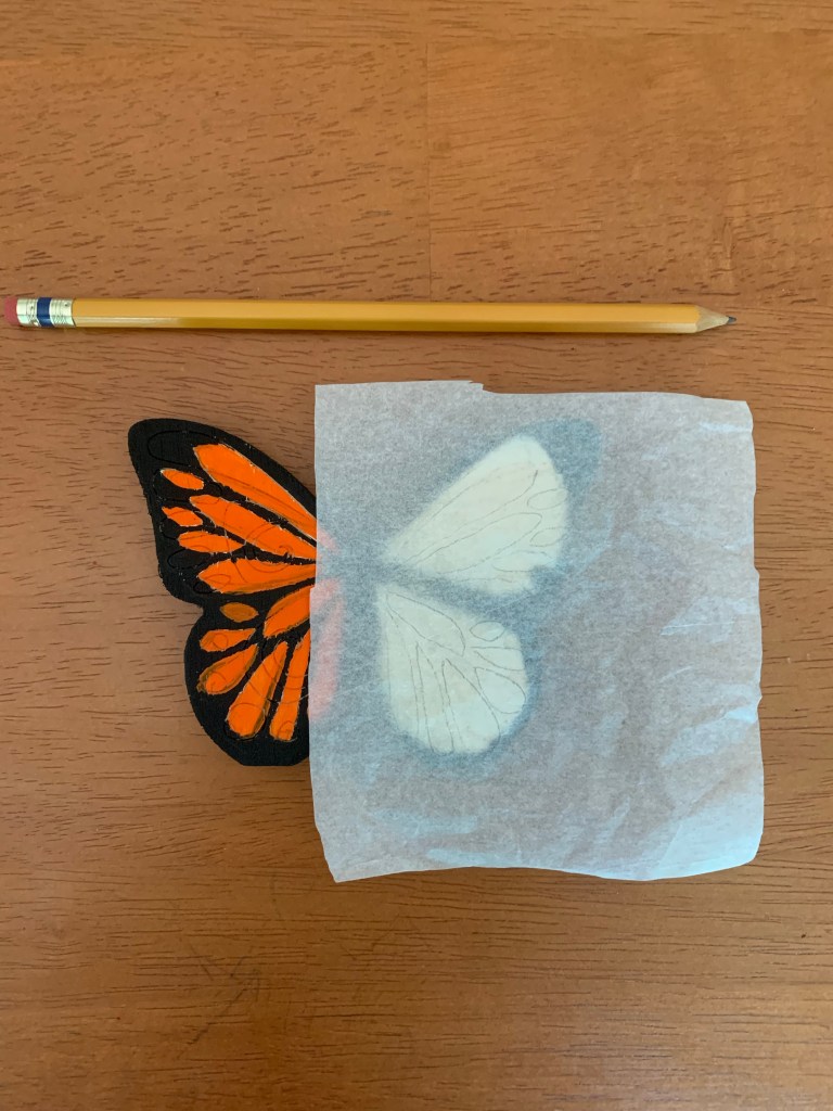 To start, I found a couple of clipart pictures of milkweed and Monarch butterflies. After printing out the pictures I wanted, I traced the milkweed using a piece of discarded tissue paper from a gift bag. Then I positioned the image of the butterfly over to where I wanted it to be in the picture and traced it into place. After that, I was ready to pin it to my board and adding sequins.