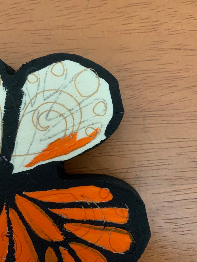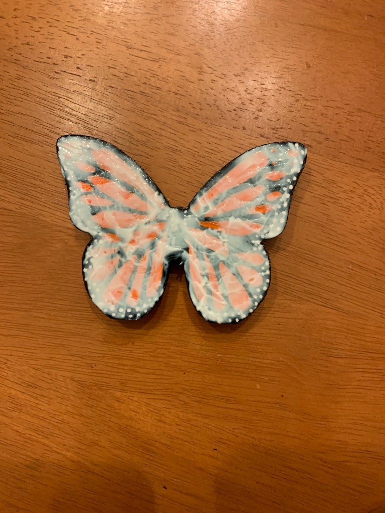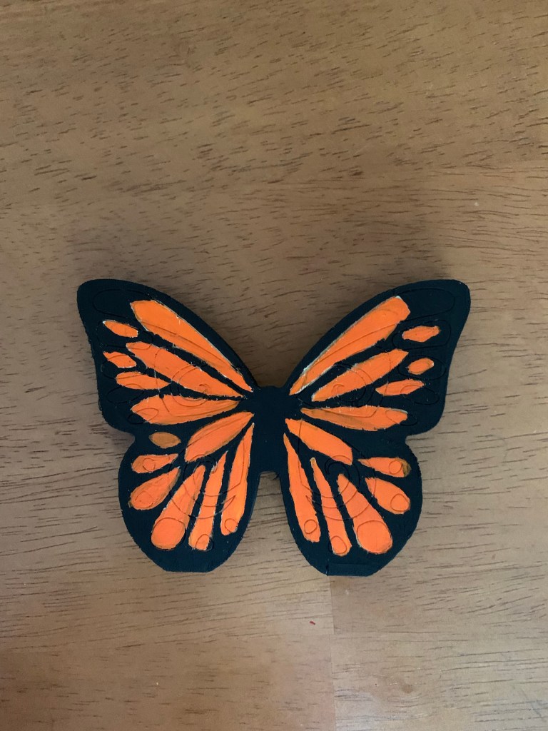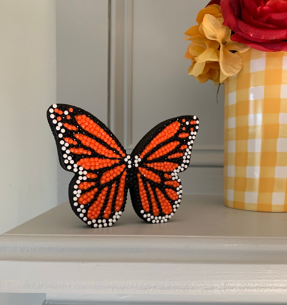 I couldn’t think of a better craft than to make a sparkly butterfly figurine for my shelf. Whenever I go to a craft store, I like to explore their wooden craft section for just this purpose. I picked up the butterfly carving a few months ago. With the Monarch migration in full swing, it’s my way to honor their beautiful wings. It doesn’t hurt that since their wings are black and orange, it fits in perfectly with the Fall.