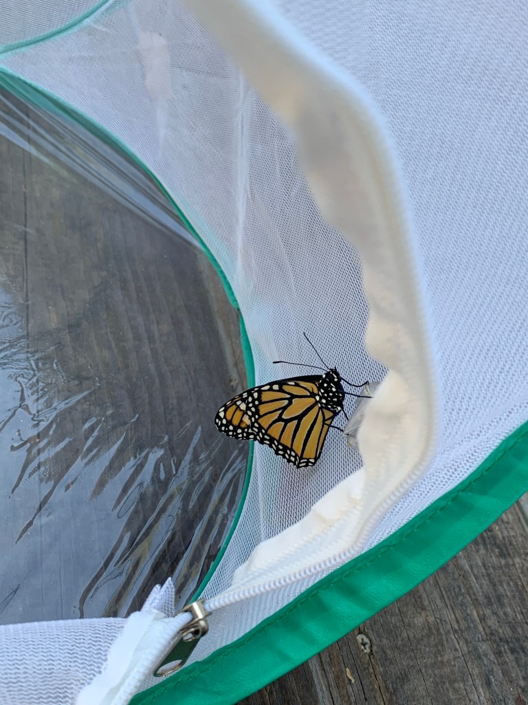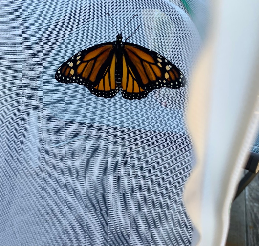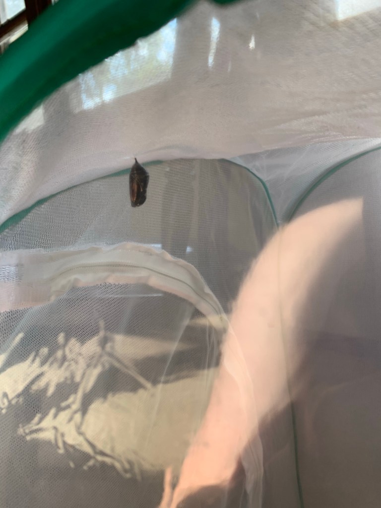 We named our little caterpillar Henry/Henrietta, since we weren’t sure if it was a male or a female. As the days went on, everyone in the family took turns watching little Henrietta grow. Then, the morning came when she left her milkweed leaves behind and began to crawl to the top of the enclosure. After nearly two weeks caring for her, it was a little sad to see her hang upside down from the top of the cage, readying her body for a massive transformation. But I knew going into this that she wasn’t mine to keep. I left for work that morning and my daughter texted me a couple hours into my shift. Henrietta was a bright, green chrysalis.